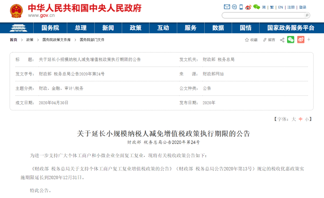 财政部、国家税务总局(5月7日)发布《关于延长小规模纳税人减免增值税政策执行期限的公告》,明确为进一步支持广大个体工商户和小微企业全面复工复业,将《财政部 税务总局关于支持个体工商户复工复业增值税政策的公告》(财政部 税务总局公告2020年第13号)规定的税收优惠政策实施期限延长到2020年12月31日。